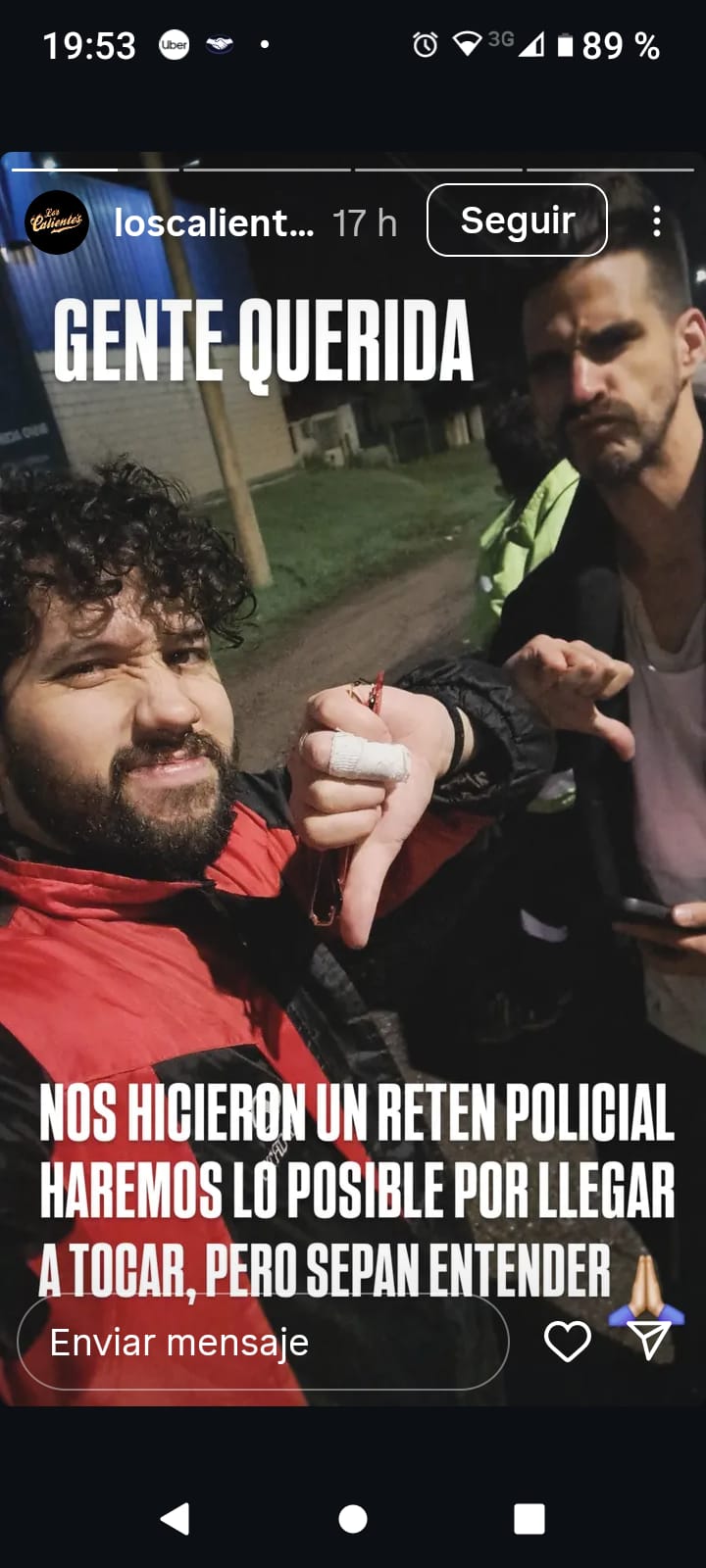 Más tarde, los músicos, integrantes del grupo Los Calientes Tributo, se quejaron en sus redes sociales porque fueron detenidos y requisados por la policía y la Guardia Urbana municipal, aparentemente por orden del intendente de Río Ceballos. La obstrucción en la salida del bar y el control policial demoraron el arribo de la banda a su siguiente show, por lo que se disculparon en sus redes.