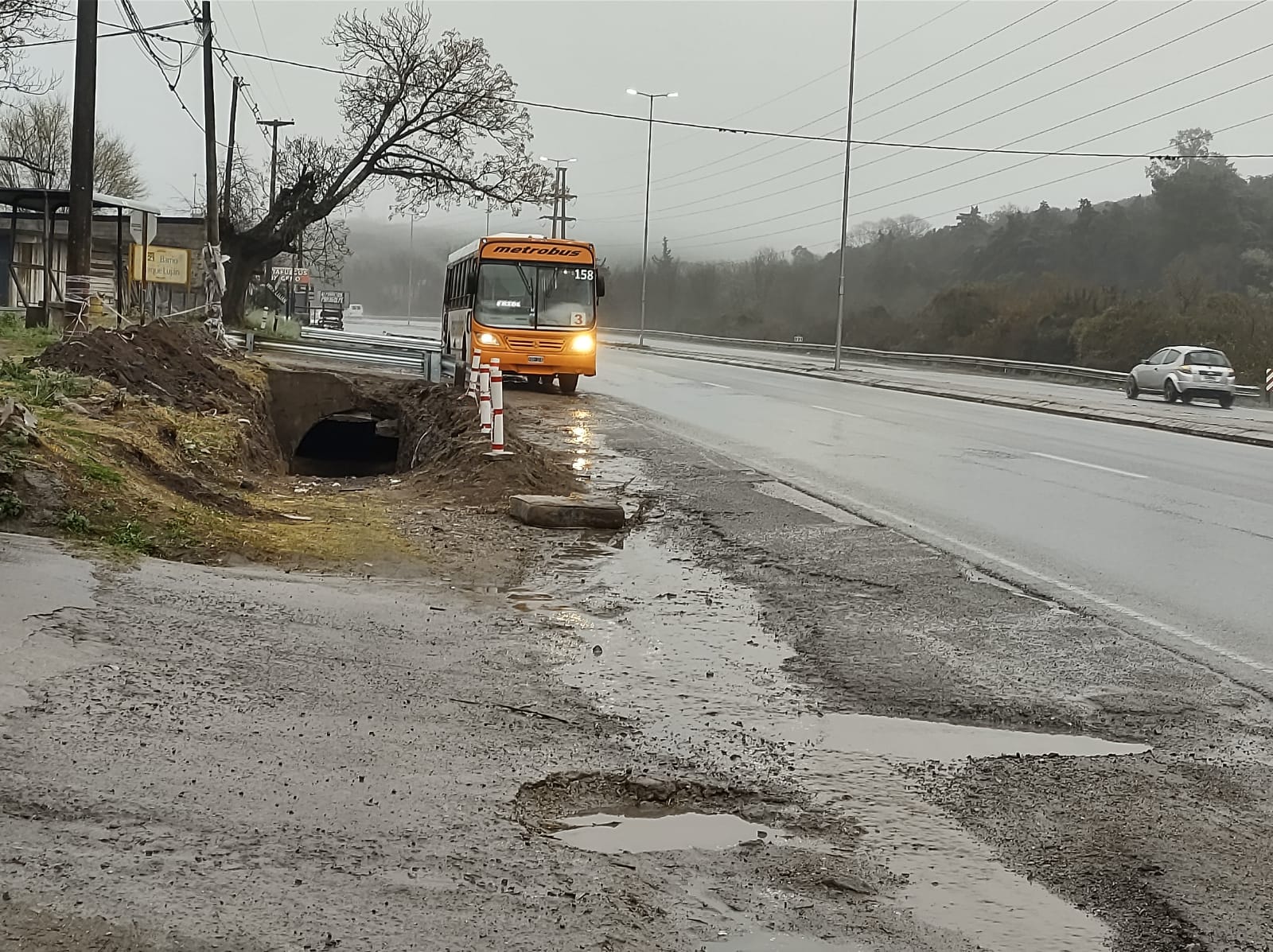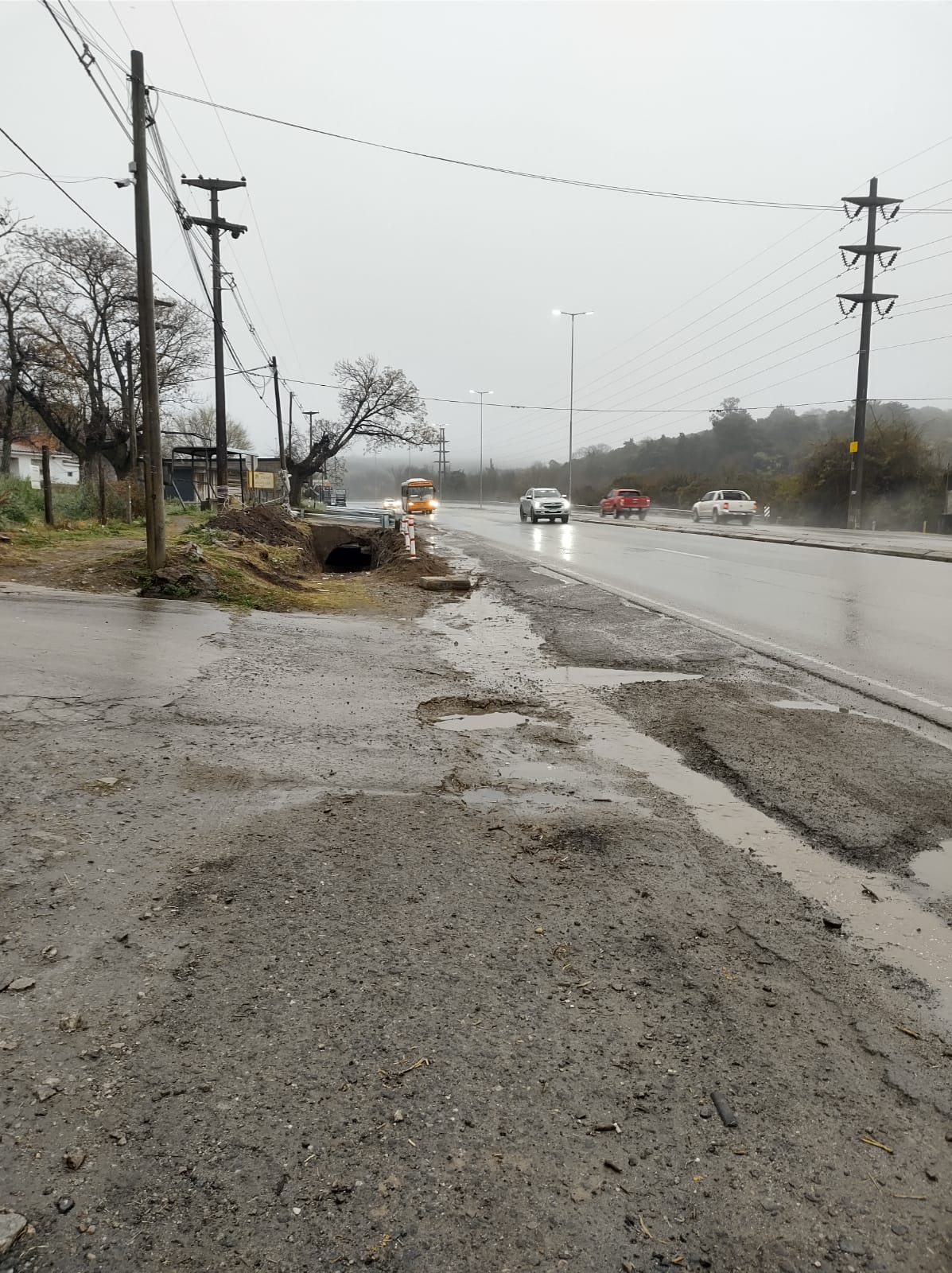 Río Ceballos. Los vecinos esperan el colectivo entre baches y bajo la lluvia sobre la E-53.