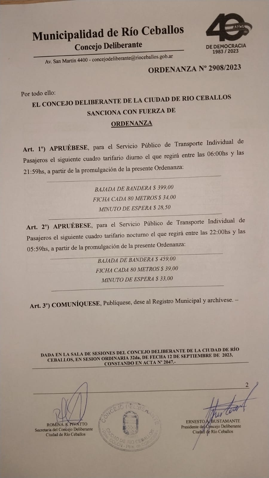 En tanto, para el servicio nocturno la bajada de bandera quedó en $459, la ficha cada 80 metros en $39 y el minuto de espera en $33.
