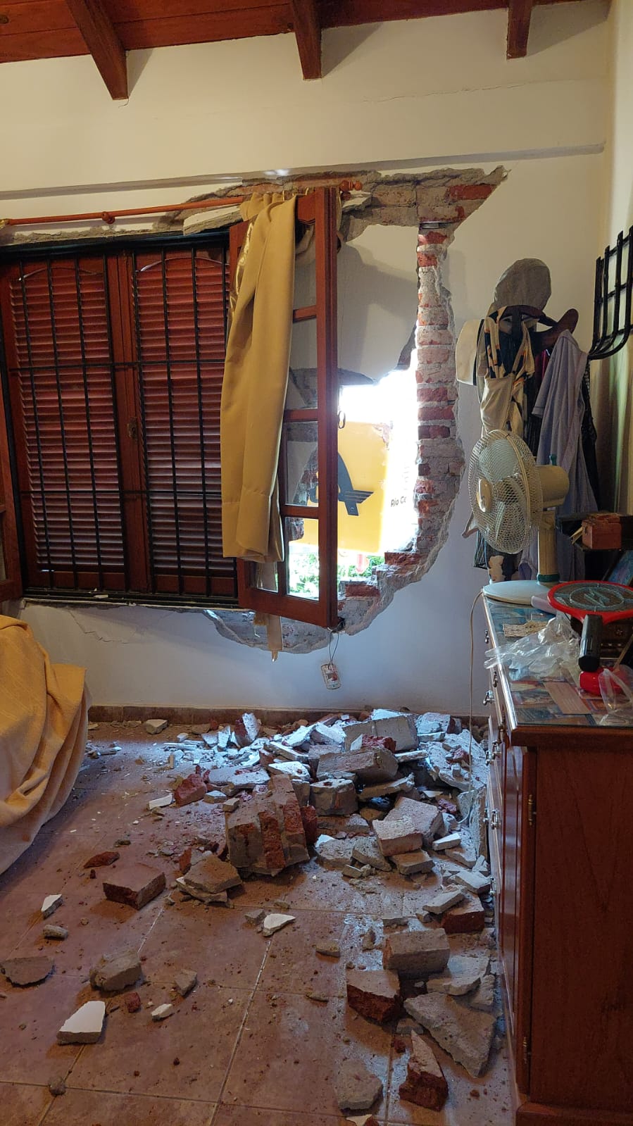 “Reventó la reja, la pirca de entrada con su reja, y se metió adentro del dormitorio. Y no fue más grave la cosa porque justo pegó en una viga de una pared perpendicular, por eso rebotó, sino me baja todo el techo”, relató ofuscado Fernández.