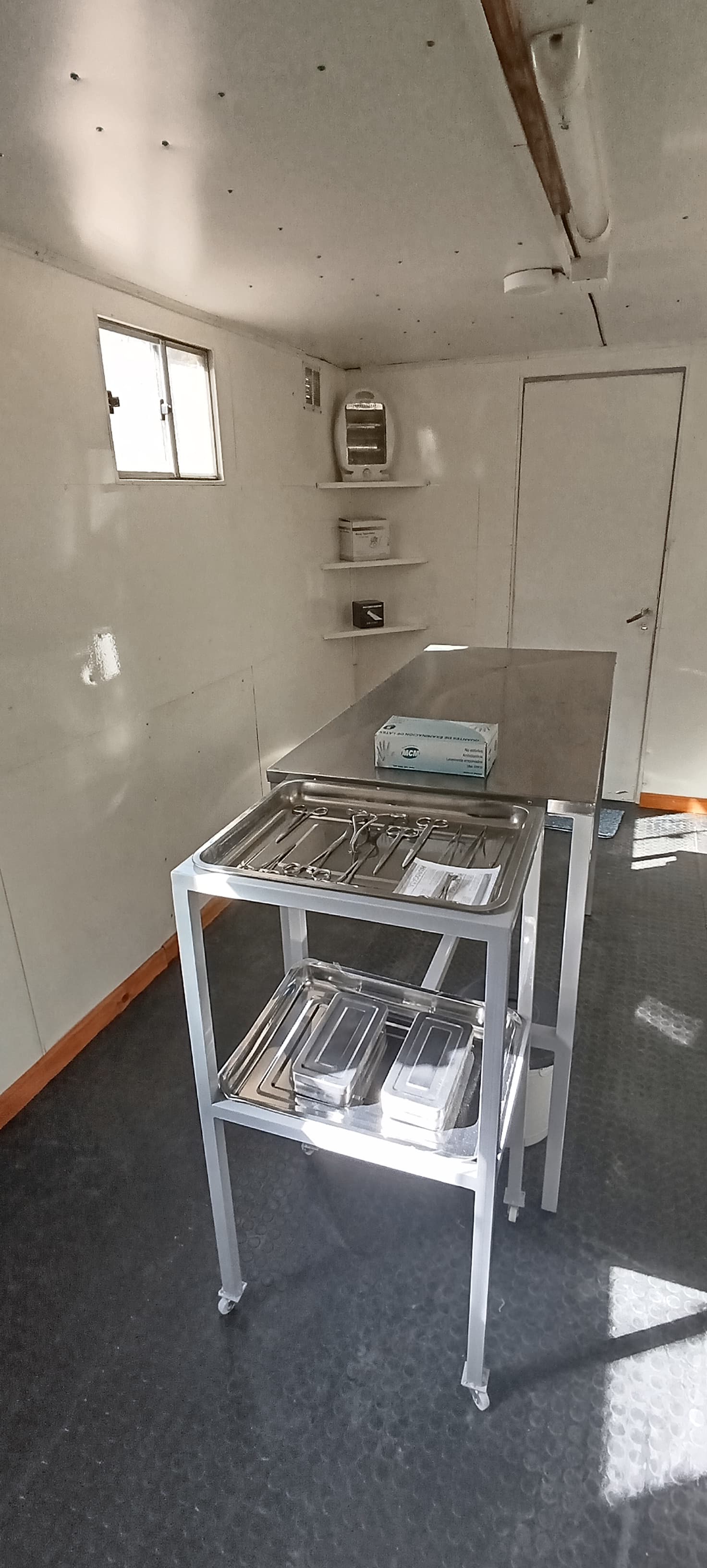 Gelsi informó que la casilla tiene tiene 6 metros de largo, y el quirófano es de 4 por dos y medio. “Después está el sector prequirúrgico, con una mesada y una jaula de acondicionamiento para la espera de los animales. También tiene bandejas con el instrumental necesario, tubo de oxígeno, estufa, red de agua caliente con una bomba y estantes para el resto de los instrumentos quirúrgicos”. Gelsi aclaró que por cuestiones de seguridad el instrumental más costos se movilizarán el mismo día de las intervenciones.