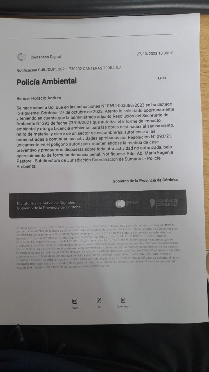 San Martín informó que la semana pasada Policía Ambiental de la provincia notificó al municipio el permiso en favor de Canteras Terra S.A para continuar extrayendo material residual del lugar. El predio es propiedad de la firma cantera Ana María, empresa que arrienda el sitio de explotación a Canteras Terra S.A